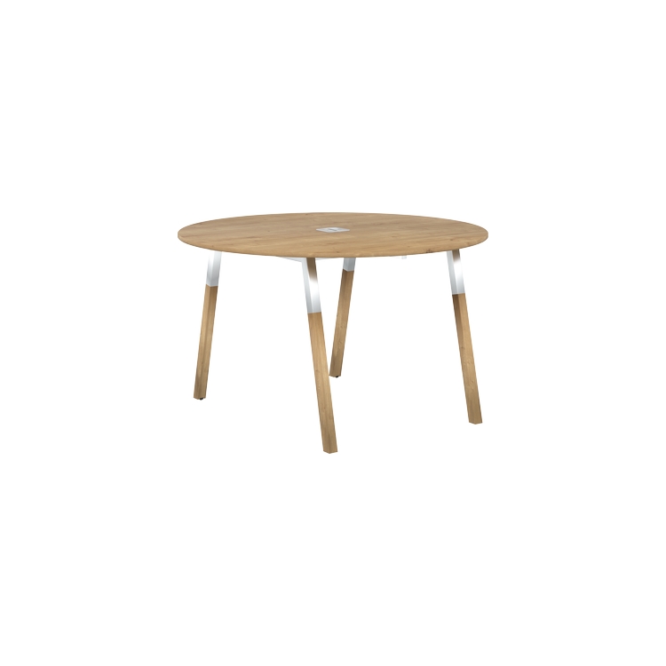 Столешница круглая из ЛДСП т.18 мм. c кромкой ABS т.2.мм, комплектуется квадратной заглушкой кабель-канала в центре, 2-мя траверсами и комбинированными опорами А-образной формы, верхняя часть из трубы 40х40 мм и нижняя часть материал – массив бука; отделка – масло-воск.