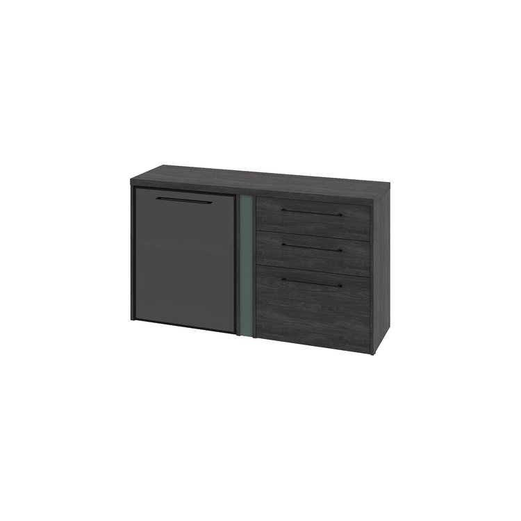 Тумба двухсекционная с левой стеклянной дверью в алюминиевом профиле и набором ящиков (3 ящика в одном наборе). Цвет профиля - черный.